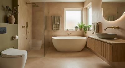 Микроцемент и известковая штукатурка: Эти материалы позволяют создать единое влагостойкое пространство без раздражающей затирки между плитками. Микроцементом покрывают стены, полы и даже монолитные столешницы под раковины.