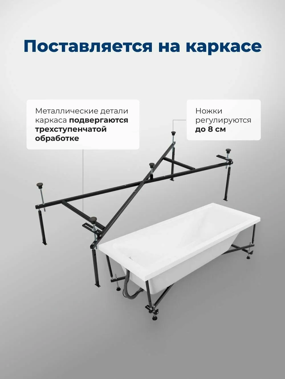 Ванна уже установлена на жесткий сварной каркас из металлического профиля. Металлические детали каркаса подвергаются трехступенчатой обработке, когда сначала профильная труба проходит абразивную зачистку на специальном станке, после чего готовые детали обрабатывают каустической содой, и, просушив, покрывают с помощью электростатического распылителя молотковой краской по металлу. Это гарантирует равномерность окрашивания и стойкость покрытия.