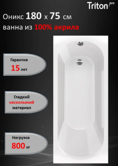Акриловая ванна Triton Pro Оникс без опоры 180x75 см