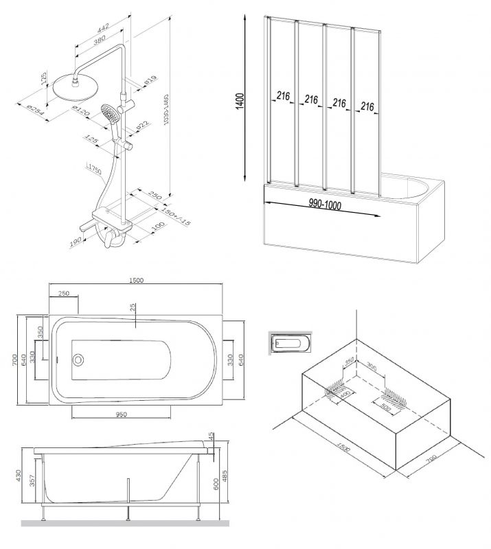 Комплект акриловой ванны со шторкой и душевой системой AM.PM Like W80ASET-150AC.Технические данные:Ванна:Цвет: белый.
