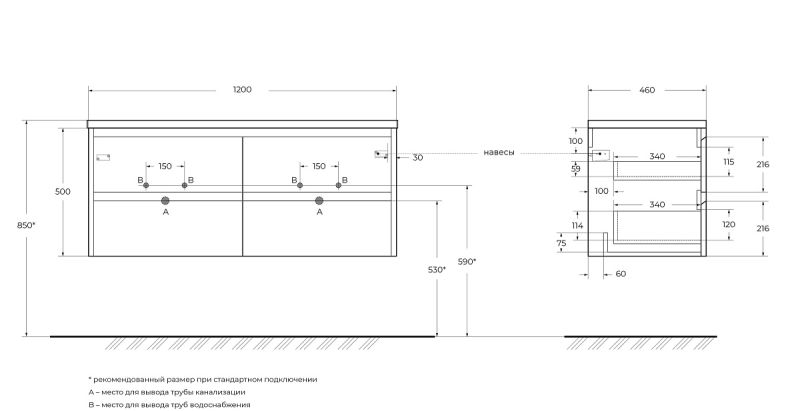 База под раковину BelBagno подвесная с четырьмя выкатными ящиками для раковины с двумя чашами, Rovere Galifax Bianco, 1200x460x500,KRAFT-1200-4C-SO-2-RGB дуб светлый купить