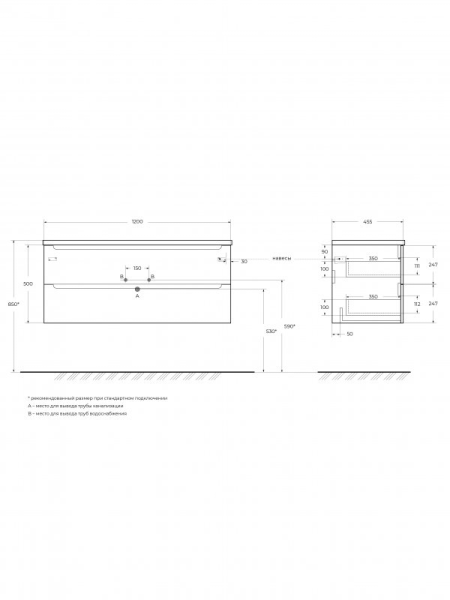 База под раковину BelBagno подвесная с двумя выкатными ящиками, с доводчиками, Bianco Opaco 1200x455x500, ETNA-1200-2C-SO-BO белый матовый купить