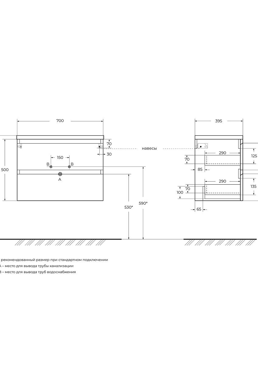 База под раковину BelBagno подвесная с фрезерованными ручк. по всей дл. фасада с 2 выкатн. ящ.700x395x500,39-700/390-2C-SO-GSO темно-серый матовый купить