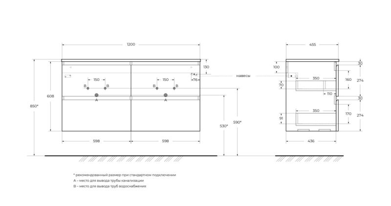 База под раковину BelBagno подвесная с фрезерованными ручками по всей длине фасада с четырьмя выкатн. ящ.1200x455x608, UNO-1200-4C-SO-VO еловый матовый