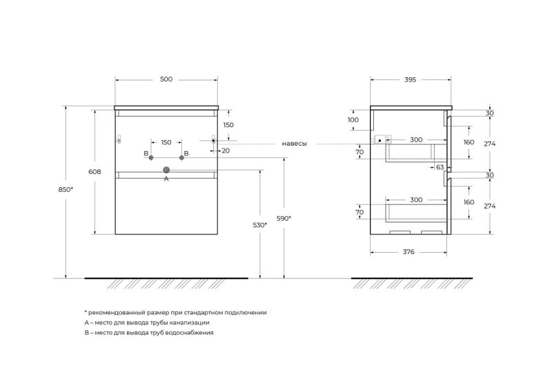 База под раковину BelBagno подвесная с фрезерованными ручками по всей длине фасада с двумя выкатн. ящ., 500x395x608,UNO-MINI-500-2C-SO-СO бежевый матовый