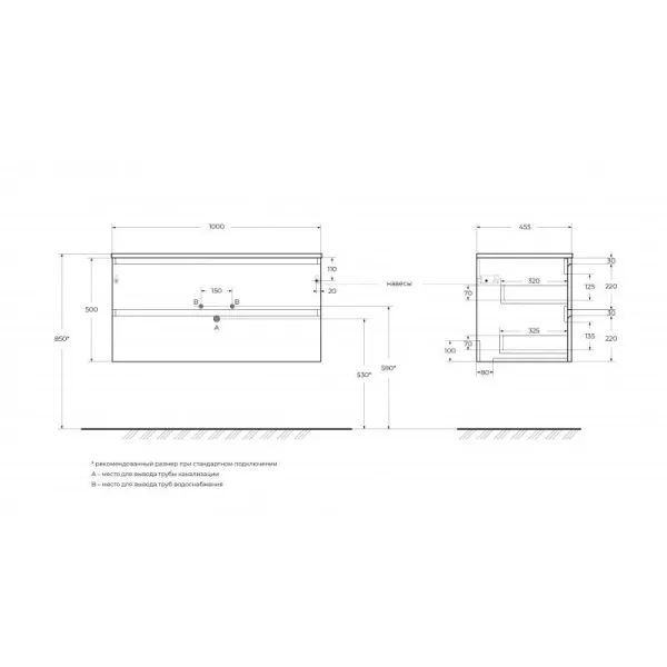 База под раковину BelBagno подвесная с фрезерованными ручками по всей длине фасада с двумя выкатн. ящ.,1000x455x500, KRAFT-1000-2C-SO-VO еловый матовый