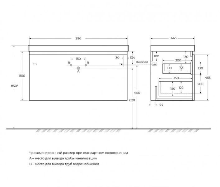 База под раковину Cezares подвесная с одним внешним и одним внутренним выкатными ящ., Брашированное золото,996x443x500, GIUBILEO-N-100-1C-SO-BORO-P купить