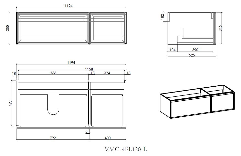 База под раковину Vincea Elise 1200 подвесная, левая, 2 выкатных ящика soft-close, серый матовый