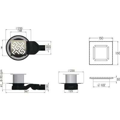 Решетка толщина 3мм, нержавеющая сталь AISI 304 Горловина трапа, пластик Фланец трапапа с переходником, РР Монтажная заглушка, PP Самопромывной S-образный сифон PP: горизонтальный выпуск D50 H60, пропускная способность 42л/мин, монтаж 360° Монтажный ключ, пластик