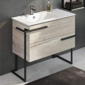 В комплекте асимметричная раковина с широким правым "крылом". В основе тумбы - каркас с полотенцедержателем из стального профиля окрашенный черной эмалью. Каркас дополняют ручки ящиков выполненные в едином стиле.Основные характеристики:Монтаж: напольный