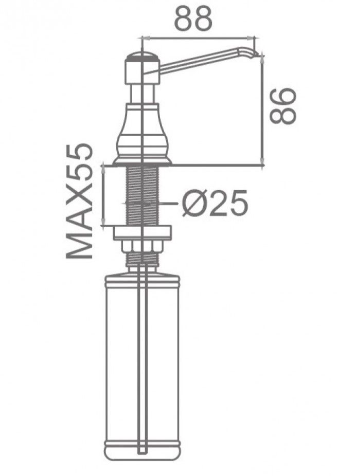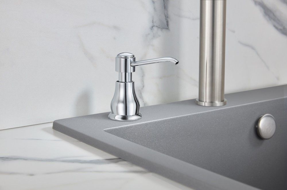 - Простота установки. Диспенсер легко встраивается в мойку или столешницу при помощи монтажной трубки и прижимной гайки.