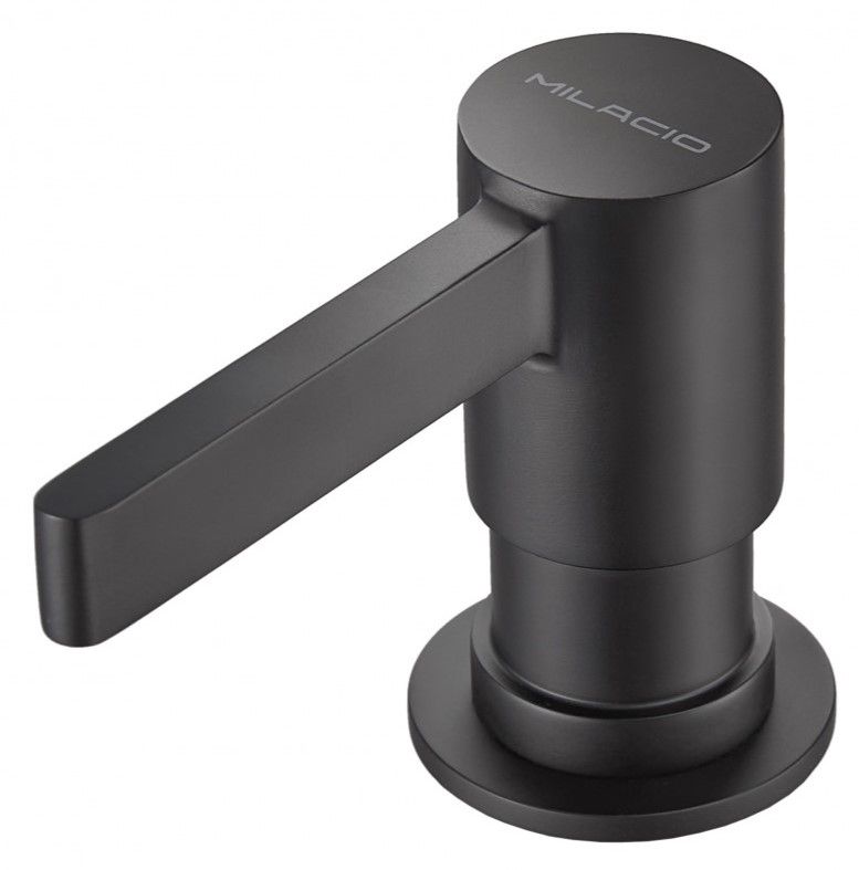 - Каменная текстура дозатора Milacio в однородном черном цвете делает дазатор универсалтным и позволяет устанавливать его с каменными мойкам любых производителей.