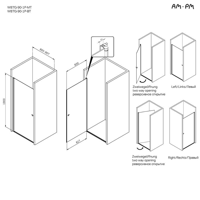 Душевая дверь AM.PM Sunny W87G-90-1P-MT прозрачное стекло профиль серебристый 90x190 купить