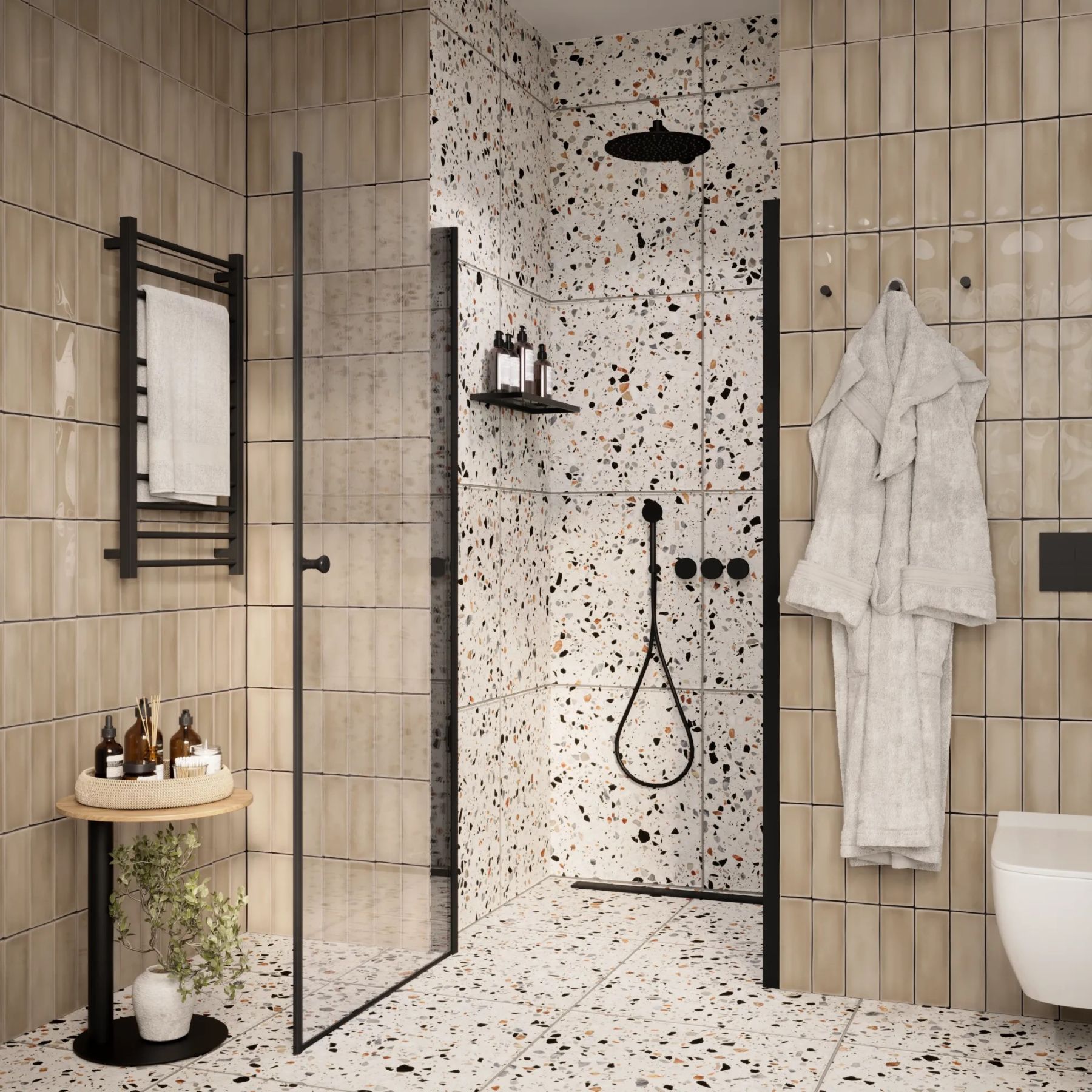 Защищает ванную комнату от брызг воды. Пол возле душевой зоны остается сухим, что снижает шансы поскользнуться после водных процедур.