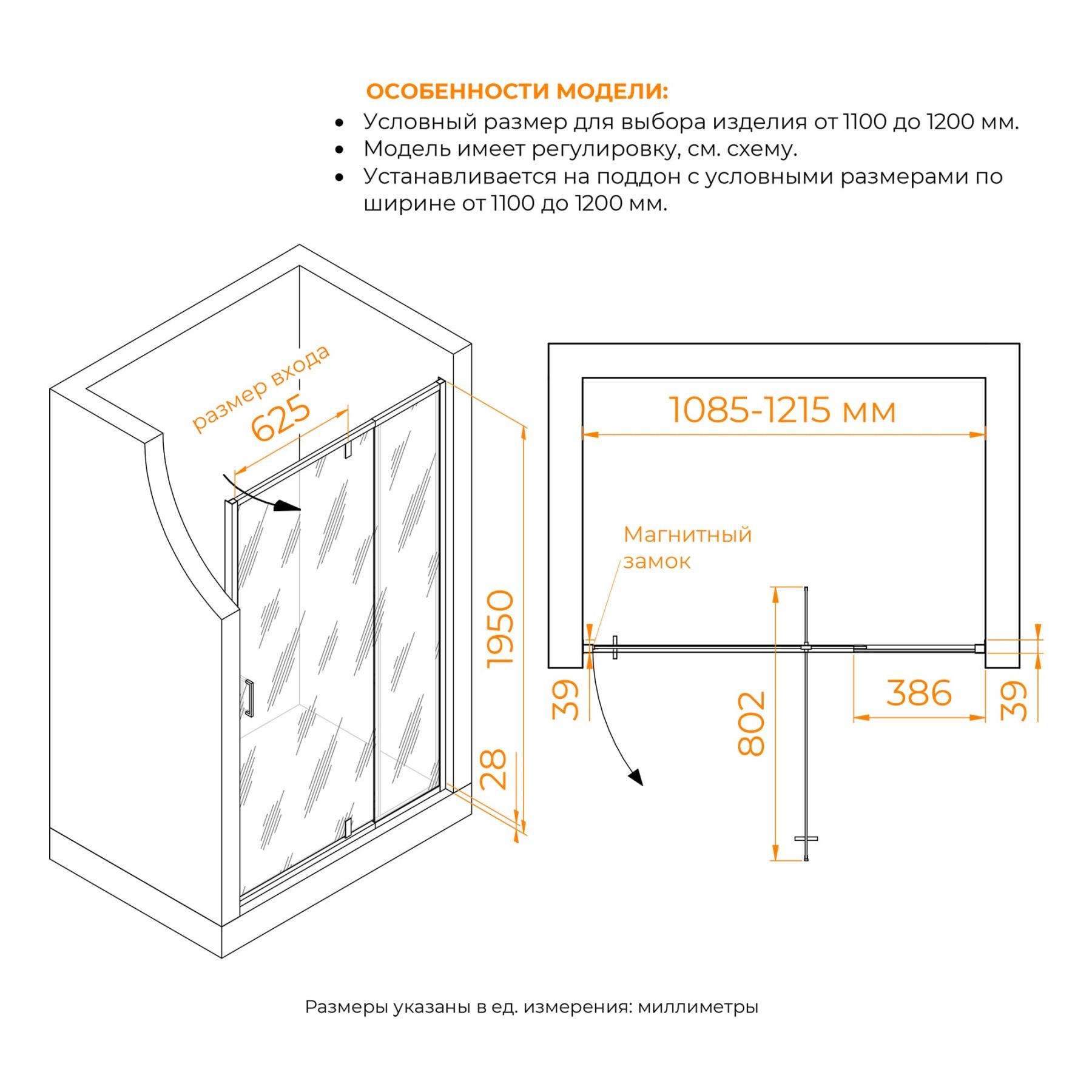 Высота двери: 195 см — обеспечивает комфортное использование душевой зоны.