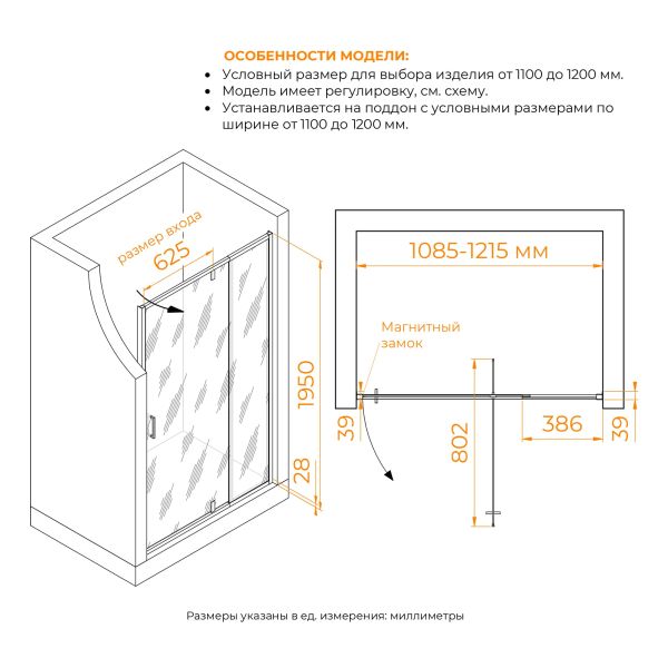Регулируемый профиль — позволяет легко настроить установку в зависимости от размеров душевого пространства.