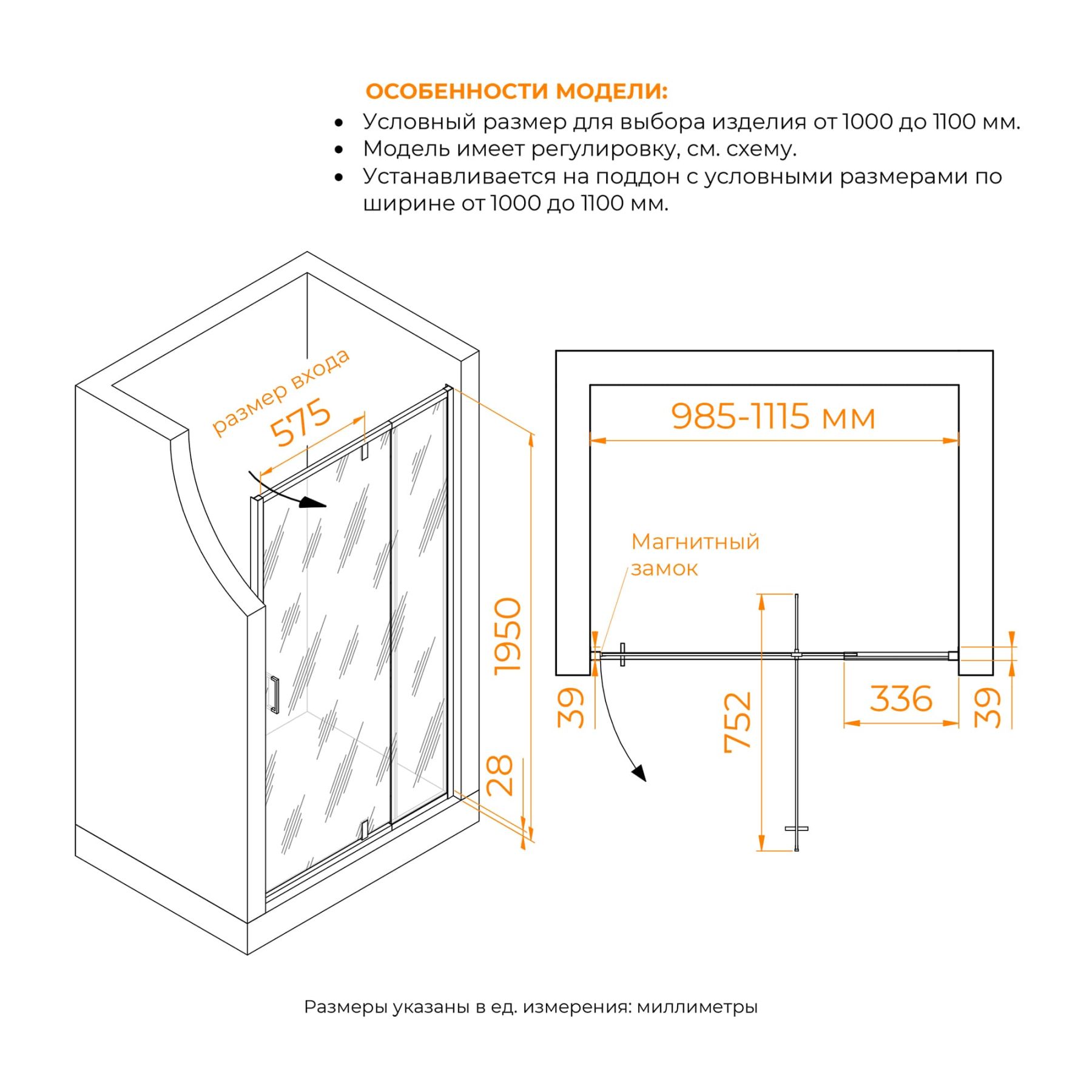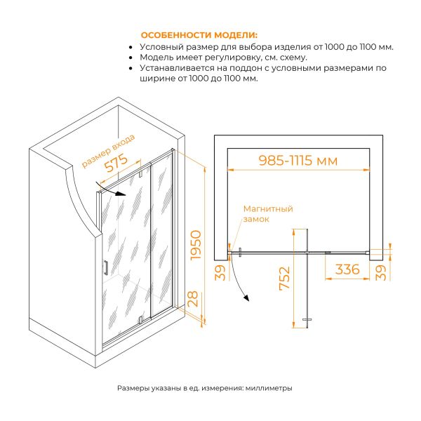 Максимальная ширина: 985 мм — подходит для различных душевых пространств.