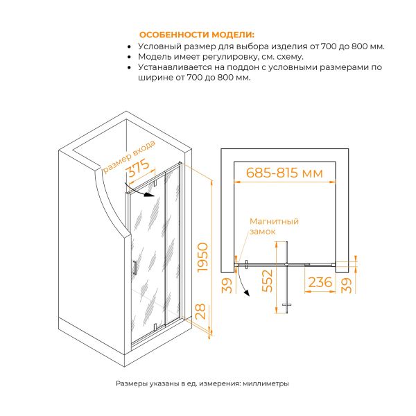 Высота двери: 195 см — обеспечивает комфортное использование душевой зоны.