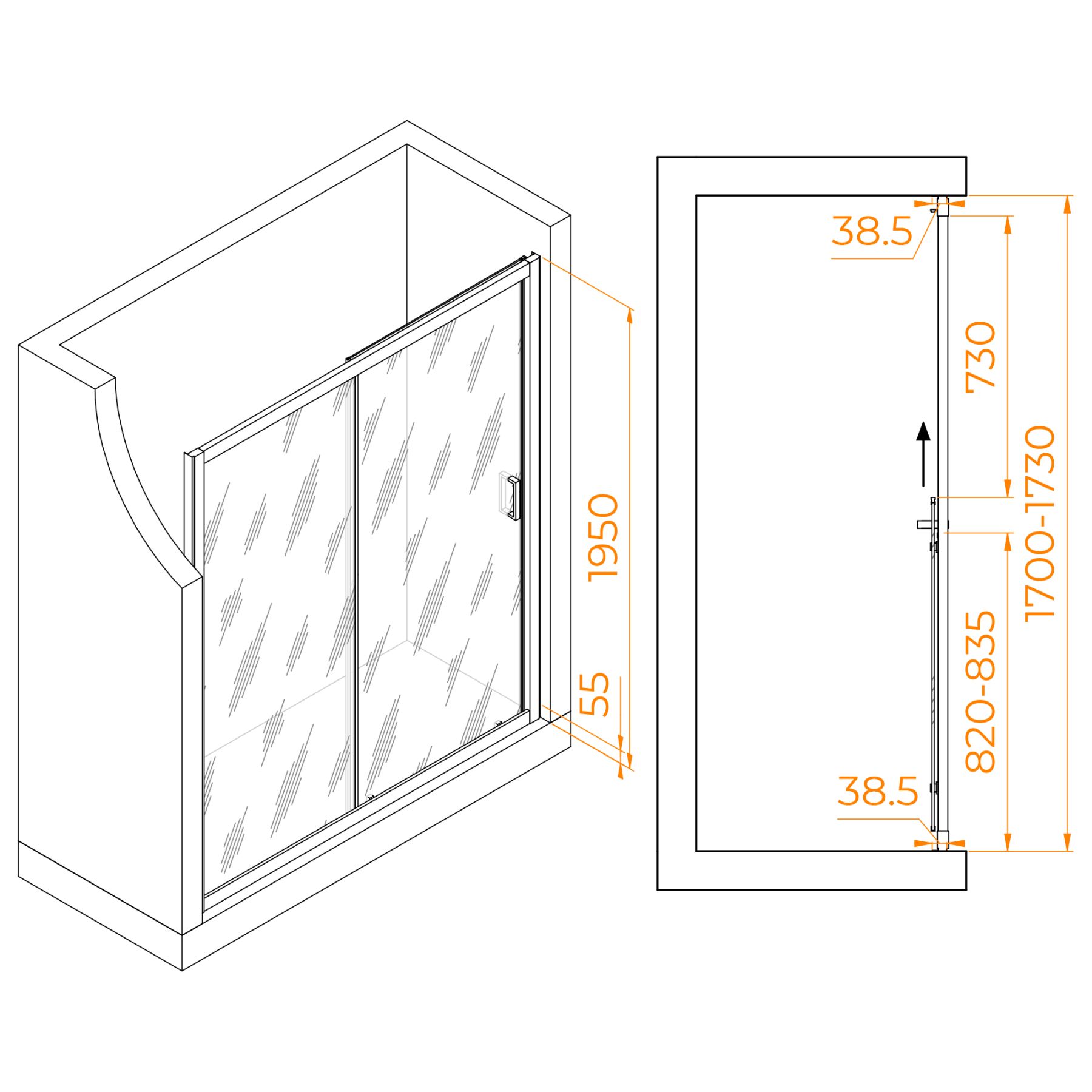 Высота двери: 1950 мм — достаточно для комфортного принятия душа.