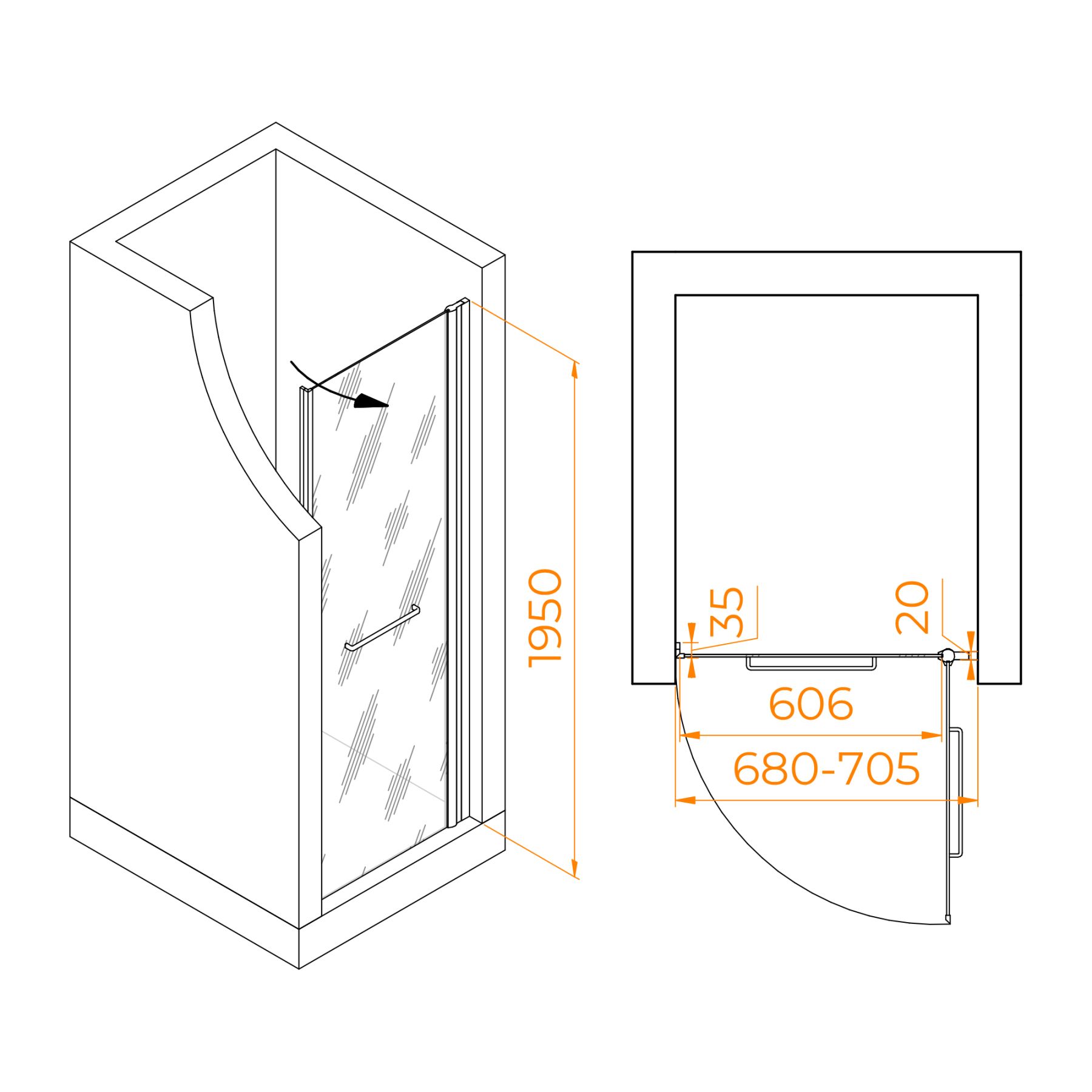Высота двери: 1950 мм — обеспечивает комфортный доступ в душевую зону.