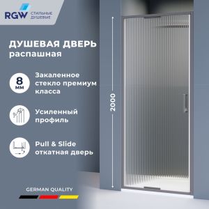 Новаторский элитный механизм открытия Pull&Slide разработан немецкими инженерами специально для компании RGW «Стильные Душевые» в технологии мягкого открытия распашной двери с малым крылом наружу. Поворотно-распашного — Pull&Slide механизм, элементы механизма выполнены из нержавеющей стали, что обеспечивает высокую устойчивость к коррозии. Система механизма соответствует высоким стандартам надежности и безотказной работы, рассчитана на 30 000 циклов работы = 15 лет службы.