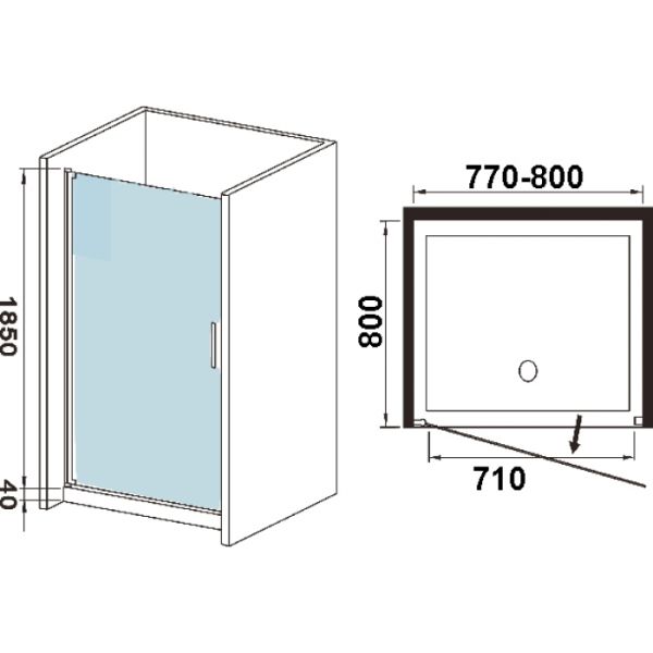 Профиль хром.Фурнитура металл хром.Стекло прозрачное 8 мм.Регулировка профиля +/- 20 мм.Механизм петель с лифтом (механизмом подьема стекла). Дверь универсальная (правая/левая).