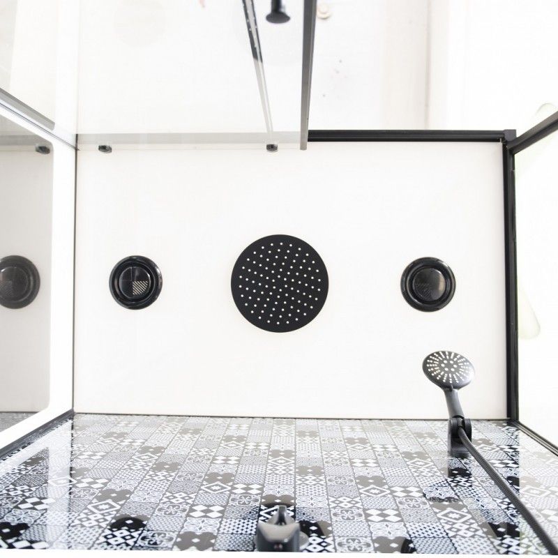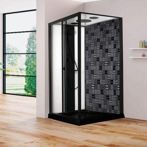 Кабина прямоугольная ESBANO ESB-1280CKR. Низкий (15 см) акриловый поддон черного цвета, сифон с гидрозатвором, крышка сифона в цвет поддона, задние стекла: закаленное крашеное чёрно-белое стекло, закаленное крашеное декорированное стекло (5 мм), передние стекла: закаленное прозрачное стекло с покрытием easy clean (5 мм), профиль матовый черный, смеситель матовый черный, душевая многофункциональная лейка со шлангом чёрного матового цвета, держатель лейки чёрный матовый, полочка для шампуня чёрная матовая, двойные (спаренные) верхние и нижние ролики чёрного цвета, верхний тропический душ чёрного матового цвета. РАЗМЕР: 120х80х210 см.