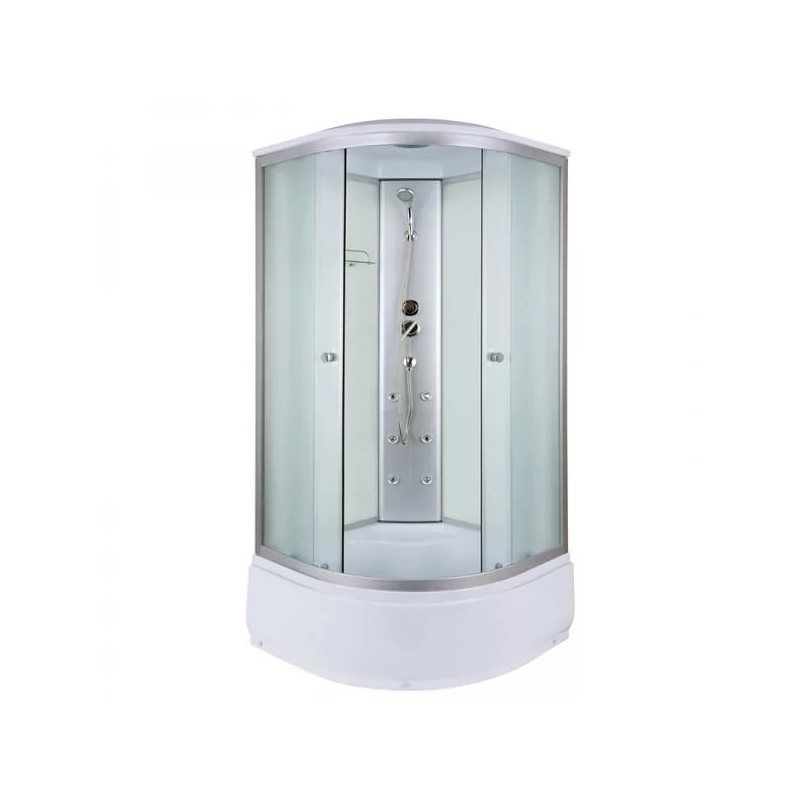 Поддон акриловый высокий 38см(сиденье на поддоне),глубина 23 см,сифон с гофрой,экран съемный, профиль матовый хром, центральная панель серебро, задние стенки закаленные, белые,крашенные,передние стекла закаленные,матовые,смеситель 2-х режимный,ручной душ, полочка.