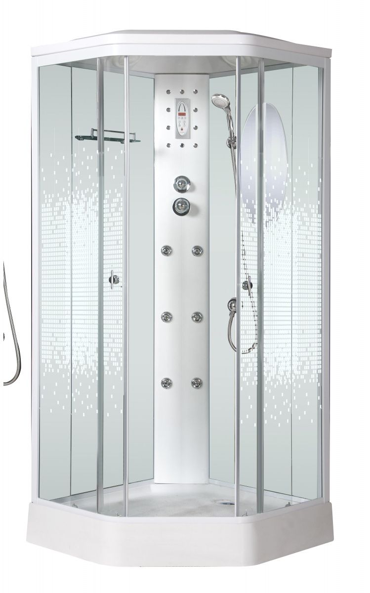 Поддон акриловый низкий 16см(трапеция), глубина 5см, сифон с гофрой,экран несъемный,профиль белый,центральная панель белая, задние стенки закаленные,белые, крашенные, передние стекла закаленные,прозрачные, рисунок мозаика, смеситель 3-х режимный,полочка,пульт, подсветка, верхний душ,ручной душ,зеркало,гидромассаж.