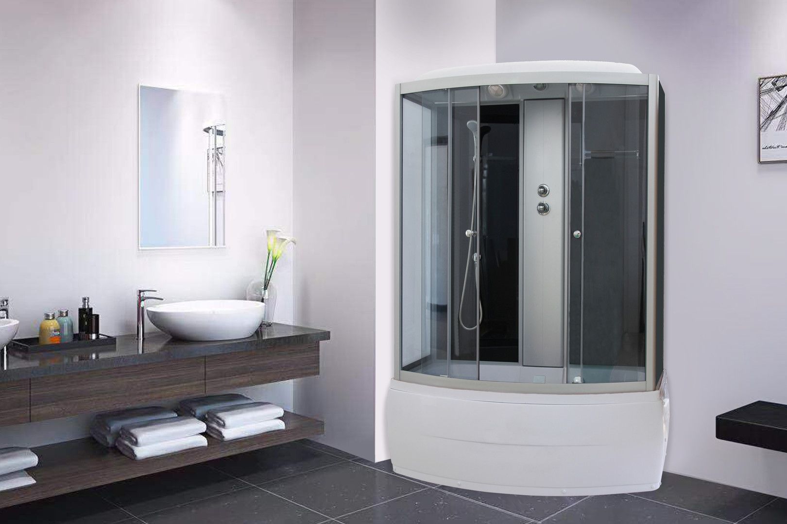 Душевой бокс Parly CNE150Размер: 150х75х215 смСтекло: 4 мм тонированное закаленноеСтенки: закаленное стекло чёрное 4 ммПрофиль: матовый хромированный алюминиевыйПоддон: высокий 50 см, прямоугольныйКомплектация: полка, смеситель, верхний душ ТРОПИК, ручной душ, слив с переливом. Без пульта, без радио, без света.Поддон, крыша, закрывающий передний экран - белый АБС пластик. Поддон армированный, высота 50 см. Профили кабины алюминиевые хромированные. Стекло закаленное. Переднее стекло прозрачное, тонированное. Задняя стекло черное, в раме. Это придает дополнительную жесткость конструкции. Внутри кабины усиленная полка 30 см с ограничителями. Центральная панель пластиковая хромированная. В кабине установлен однорычажный смеситель, верхний (тропический) душ, ручной душ, вентиляционные отверстия. На дверях F образные реснички – уплотнители повышают герметичность кабины. Двери раздвижные на роликах (одинарные внизу, двойные вверху). При закрывании двери фиксируются магнитными лентами под углом 45%. Это устраняет зазоры и исключает необходимость регулировки дверного проема. Усиленный металлический каркас с ребром жесткости по всей длине поддона. Слив – перелив, шланг длиной 65 см, "антизапах". Вся фурнитура хромированная. Кожух поддона на защелках. Противоскользящее покрытие поддона. Без пульта ДУ.ПРЕИМУЩЕСТВА душевого бокса Parly BNE150: повышенная жесткость и устойчивость конструкции. Герметичность. Увеличенный внутренний объем. Безопасность за счет отсутствия электроподключения. Экран на защелках. Двойные надежные ролики на дверях.Внимание! Производитель оставляет за собой право вносить изменения в конструкцию и комплектацию моделей без предварительного уведомления!