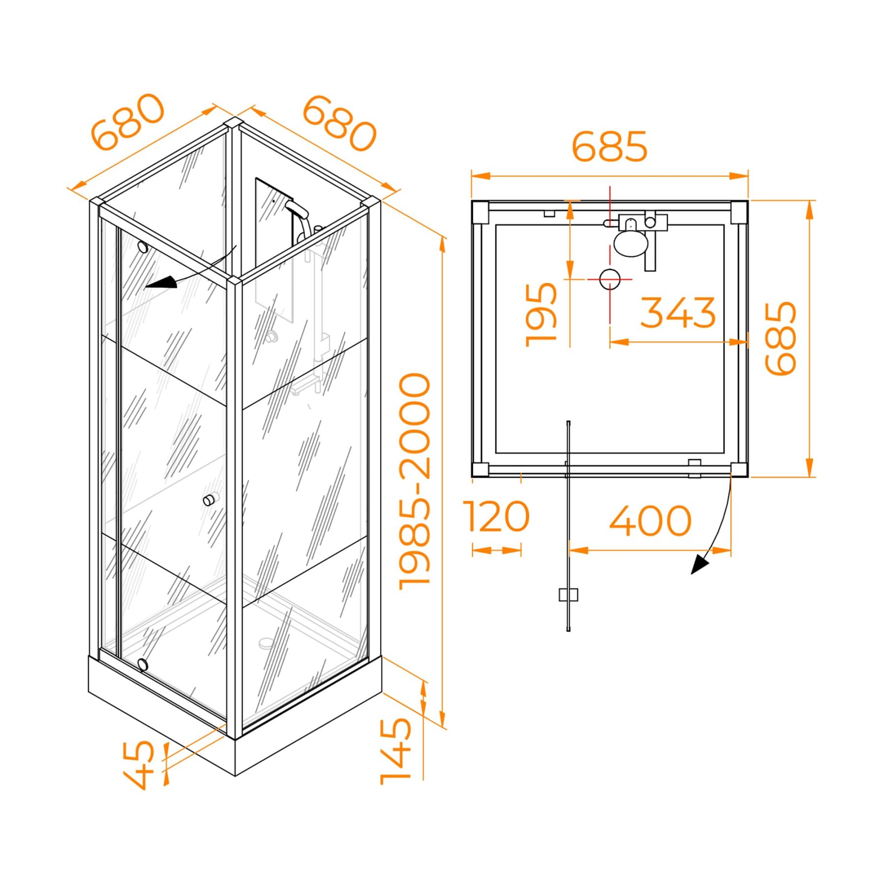 Открытие в любую сторону, как на левую, так и правую сторону распашной двери делает данную модель душевой кабины универсальной. Душевая кабинка полностью в раме, в которую установлено безопасное, закалённое стекло 6 мм. Дверь имеет два полотна – одно стационарное, другое распашное. Рабочий механизм – поворотная петля, качественно закреплена на профиле.