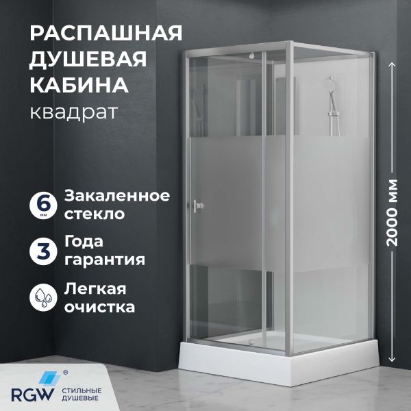 Удобная и популярная квадратная душевая кабина в разных размерах, распашная дверь, безопасное закалённое прозрачное с матовой полосой посередине стекло, профиль Сатин - Браш - RGW AN-207, это минималистичное, удобное и законченное изделие из стекла для душа, имеет функционал душевого бокса без крыши и форсунок для гидромассажа. Данная модель душевой кабины удовлетворит практически каждого покупателя, кому требуется душ быстро, без заморочек. Модель спроектирована в классическом стиле, но имеет ряд надежных, качественных особенностей, влияющих на повышение ее стоимости перед другими аналогами, например высококачественная покраска алюминиевого профиля в Сатин - Браш цвет и крепкий душевой поддон у основания, устойчивость к повреждениям и долговечный срок службы фурнитуры. Если вы ищите качественную и быстро сборную отдельно стоящую кабину в дом или баню — это модель для вас, она имеет высокий рейтинг продаж и удовлетворяет потребности клиента, стремящегося к быстрому и удобному принятию душа.