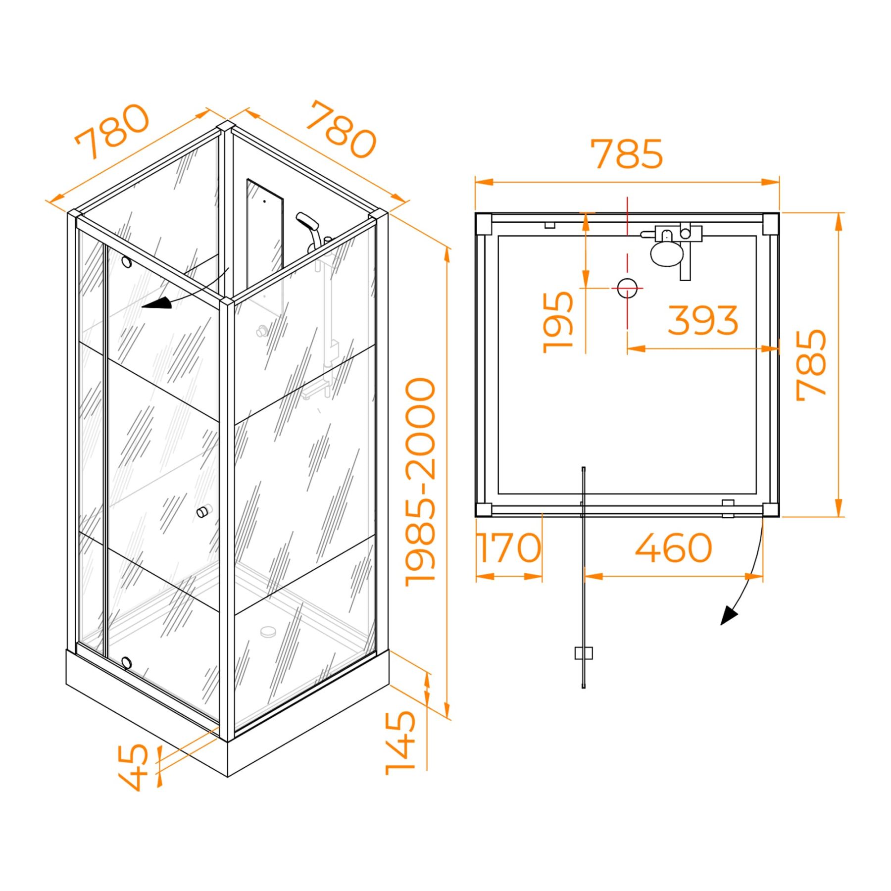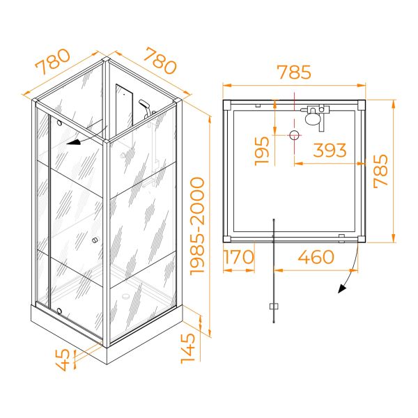 Распашная дверь кабинки обладает ручкой кноб, у двери плавный ход и полная герметичность. На стекло одет магнит, он герметизирует кабину со стороны входа.