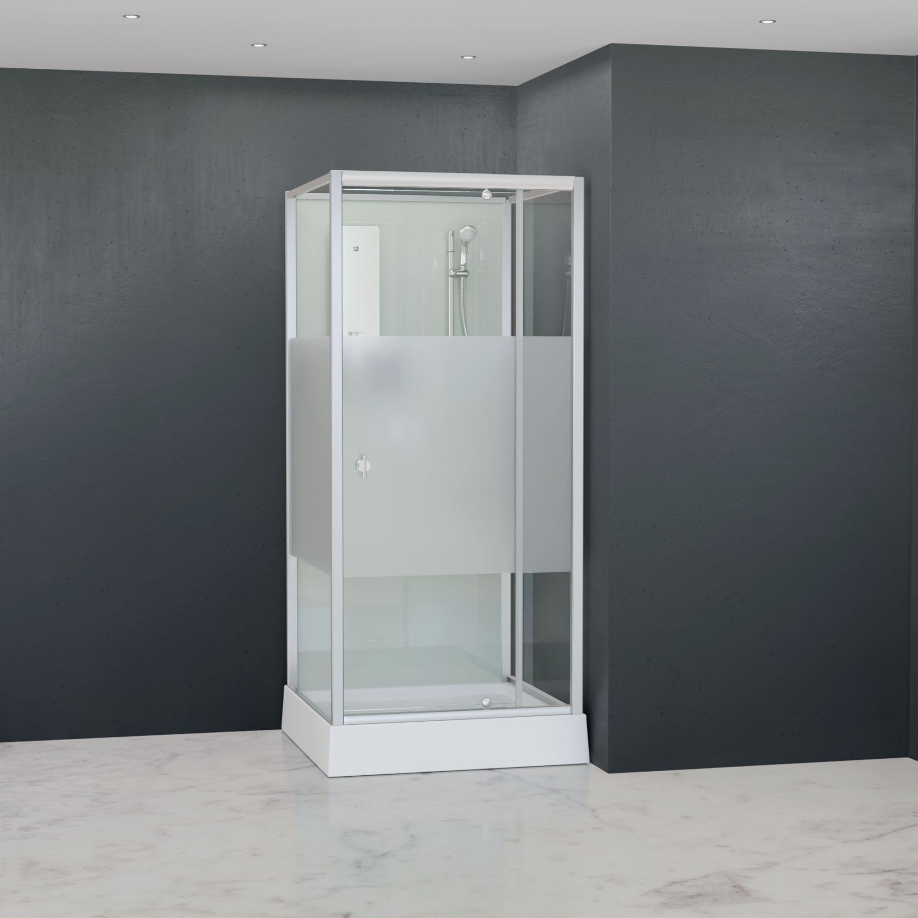 Эстетическая привлекательность — прозрачное стекло создаёт визуальную лёгкость, а матовая полоса на стекле создает полную интимность для купающегося, матовый окрас профилей придает интерьеру ванной комнаты современный и стильный вид. Задняя стена из стекла полностью матовая, таким образом подводка скрыта от глаз принимающего душ.