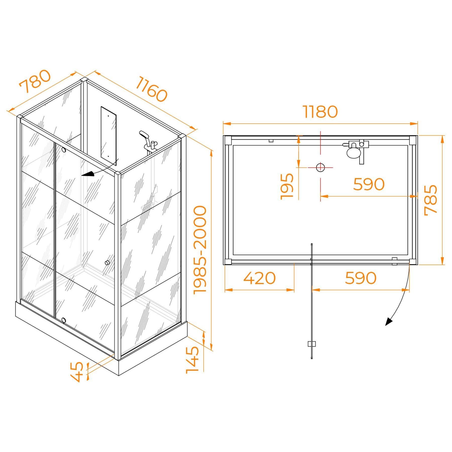Высота: 2150 мм с душевым поддоном