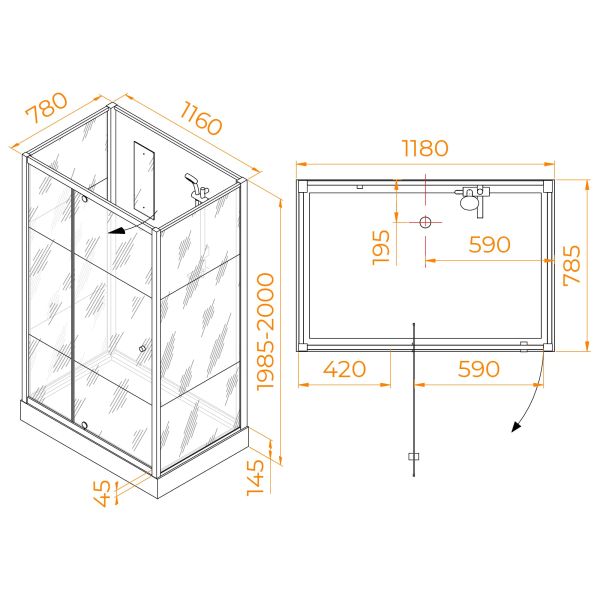 Распашная дверь кабинки обладает ручкой кноб, у двери плавный ход и полная герметичность. На стекло одет магнит, он герметизирует кабину со стороны входа.