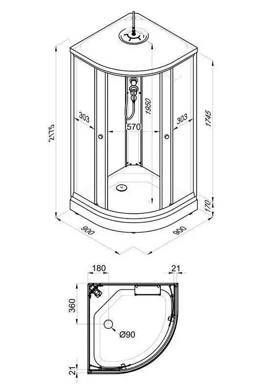 ДК Лайт 90*90 А, 7 мест+сифон D90