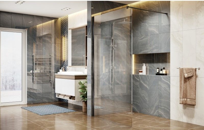 Это решение экономит место в ванной комнате. Также с помощью неподвижной стенки можно, например, отгородить стиральную машину, шкаф, раковину или унитаз.