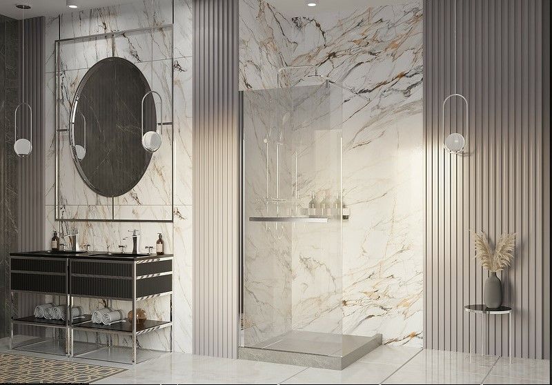Это решение экономит место в ванной комнате. Также с помощью неподвижной стенки можно, например, отгородить стиральную машину, шкаф, раковину или унитаз.