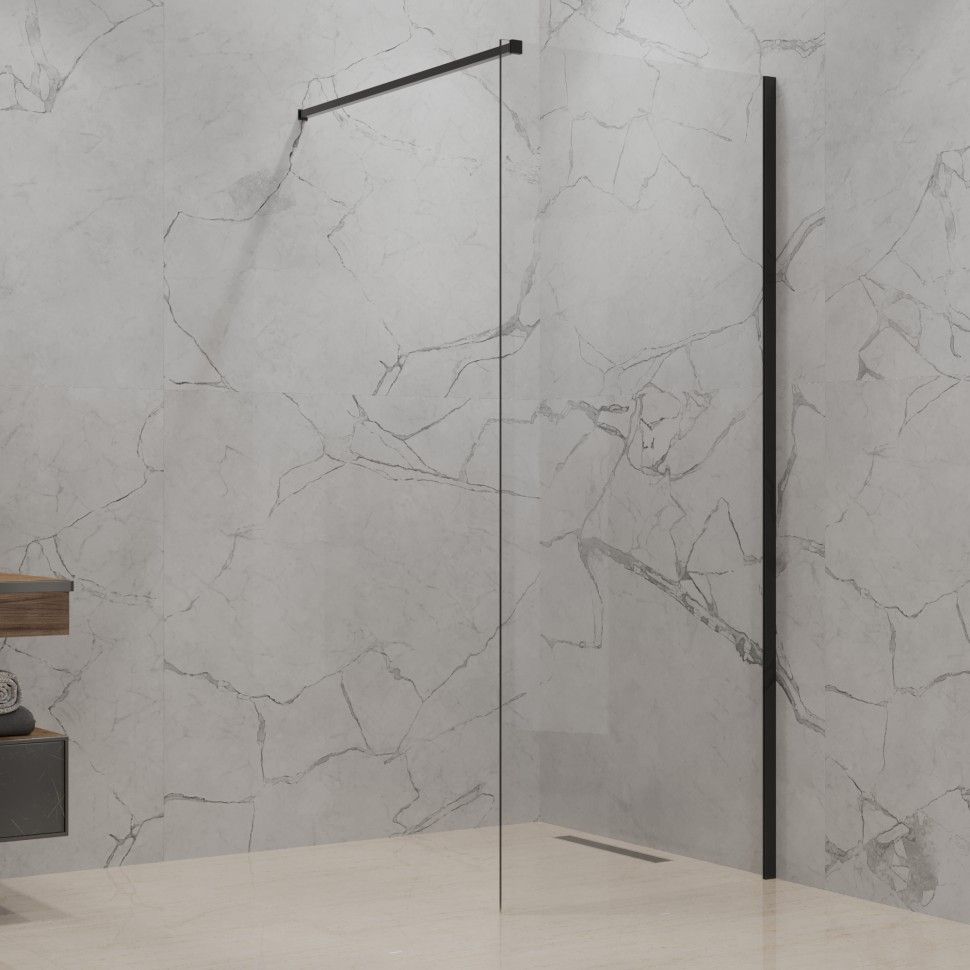 Душевая перегородка без рисунка PAINI позволяет комплексно подойти к обустройству безбарьерной зоны в ванной комнате. Визуальная легкость конструкции обеспечивается сочетанием пристенного профиля из анодированного алюминия с прочным покрытием черного цвета и закаленного стекла. Лаконичный дизайн, современные материалы, а также простота в уходе и безопасность – все это делает ширмы PAINI оптимальным решением для обустройства душевой зоны.Надежная конструкцияБезопасное закаленное стекло, не оставляющее мелких осколков при разбивании.Долговечный профиль из анодированного алюминия в порошковой окраске черного цвета (YO) легок в уходе и устойчив к механическим и химическим повреждениям.Минималистичный вариант организации душевого пространстваИзделия Walk-In – это тренд современной душевой зоны, который легко вписывается и дополняет любой дизайн: с помощью ширмы можно зонировать пространство, добавить элемент декора.Универсальность применения: благодаря Т-образному фиксатору есть возможность собрать душевой уголок из двух перегородок, а монтаж возможен как на душевые поддоны, так и на пол.Защита от протечекПрофиль обеспечивает необходимую регулировку ± 20 мм при монтаже ширмы, а уплотнитель между стеклом и профилем – надежную защиту от вытекания воды.Легкая уборкаКонструкция перегородки облегчает уборку, так как труднодоступные места отсутствуют. Для ухода за стеклом нет ограничений в использовании моющих средств.Вариативность размеровРазмерный ряд - 80х195, 90х195, 100х195, 110х195, 120х195 см, что позволяет использовать перегородки PAINI как в просторных, так и в небольших помещениях.Безбарьерная зона Преимущество конструктивных решений Walk-In - отсутствие порогов и дверей в душевой зоне.