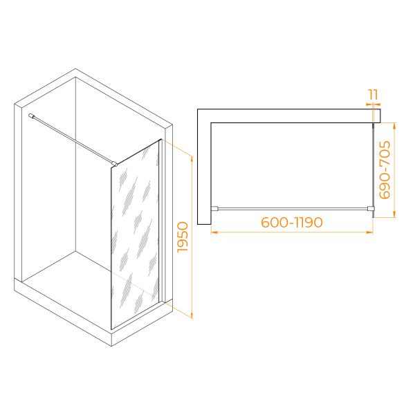 Высота перегородки: 1950 мм — обеспечивает комфортное использование душевой зоны.