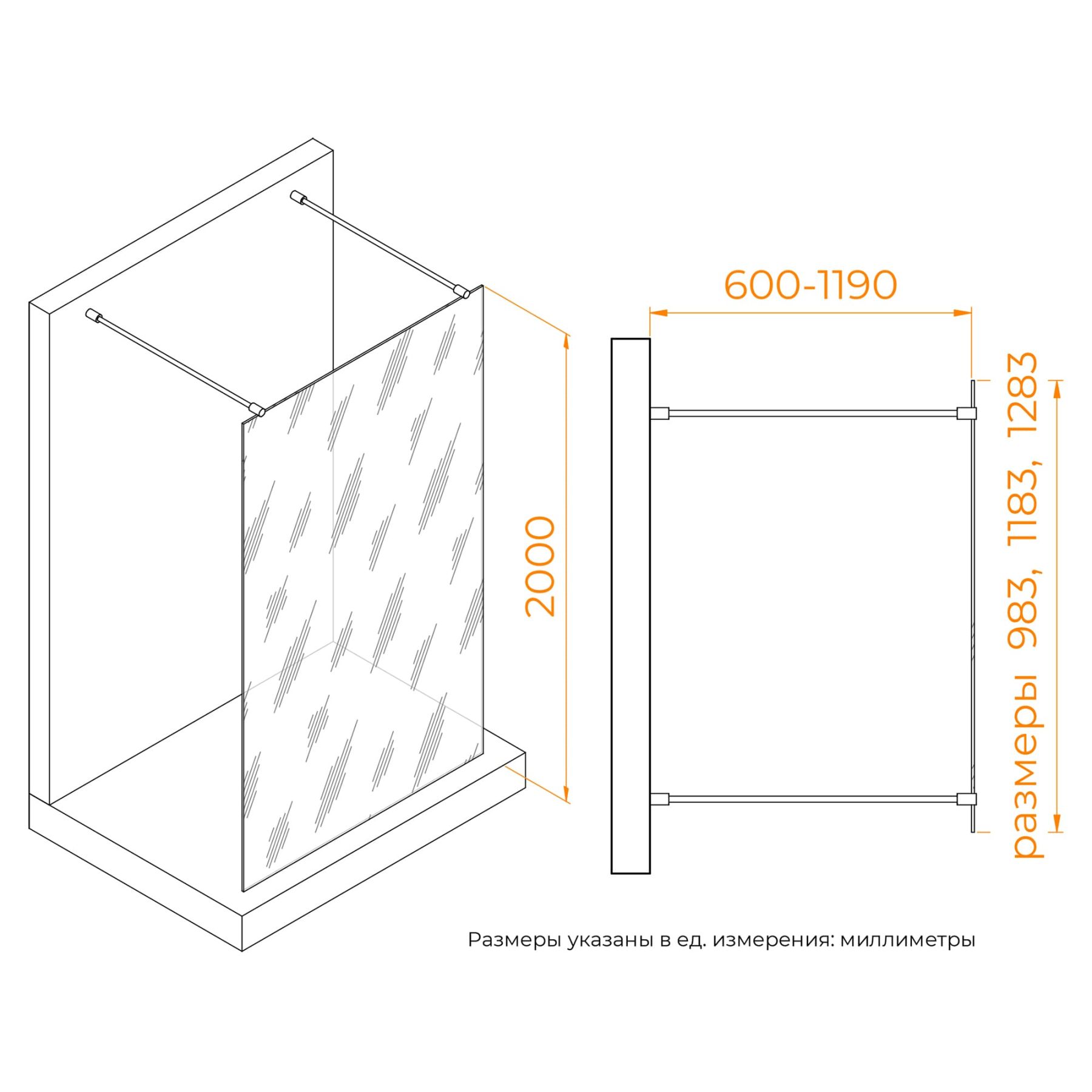 ОГРАЖДЕНИЕ из стекла высотой 2000 мм с двумя параллельно установленными кронштейнами (держателями) из нержавеющей стали, которые, закрепляя стекло в виде стены, образуют душевое пространство по системе Loft (Лофт), то есть душевая кабина на туннельный вход с двух сторон – «Walk In Double».