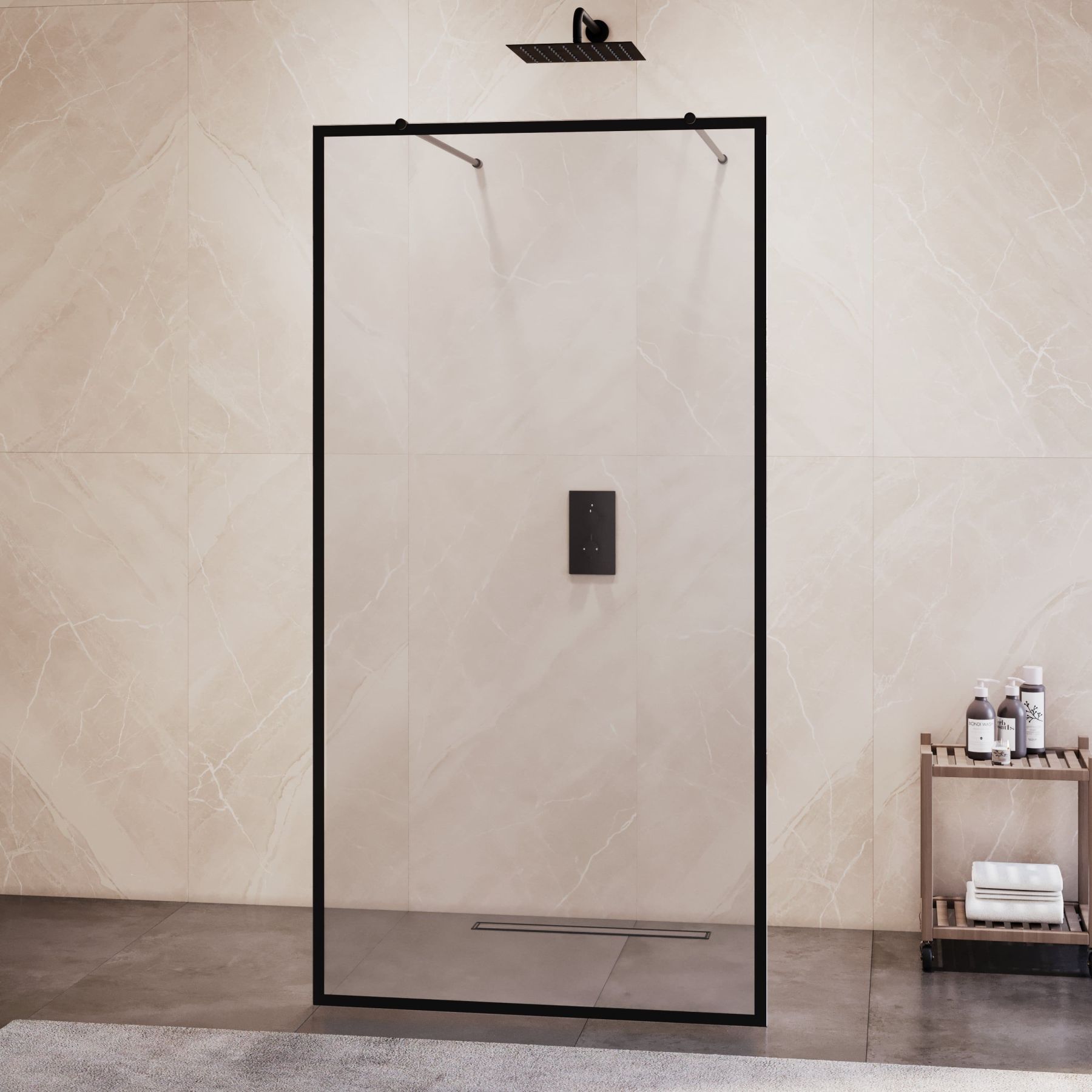 Две усиленные штанги и стекло образуют душевое ограждение безрамного типа. Штанги выполнены из нержавеющей стали с гальваническим покрытием, что обеспечивает антикоррозийные свойства, безупречную прочность для стабильности конструкции.