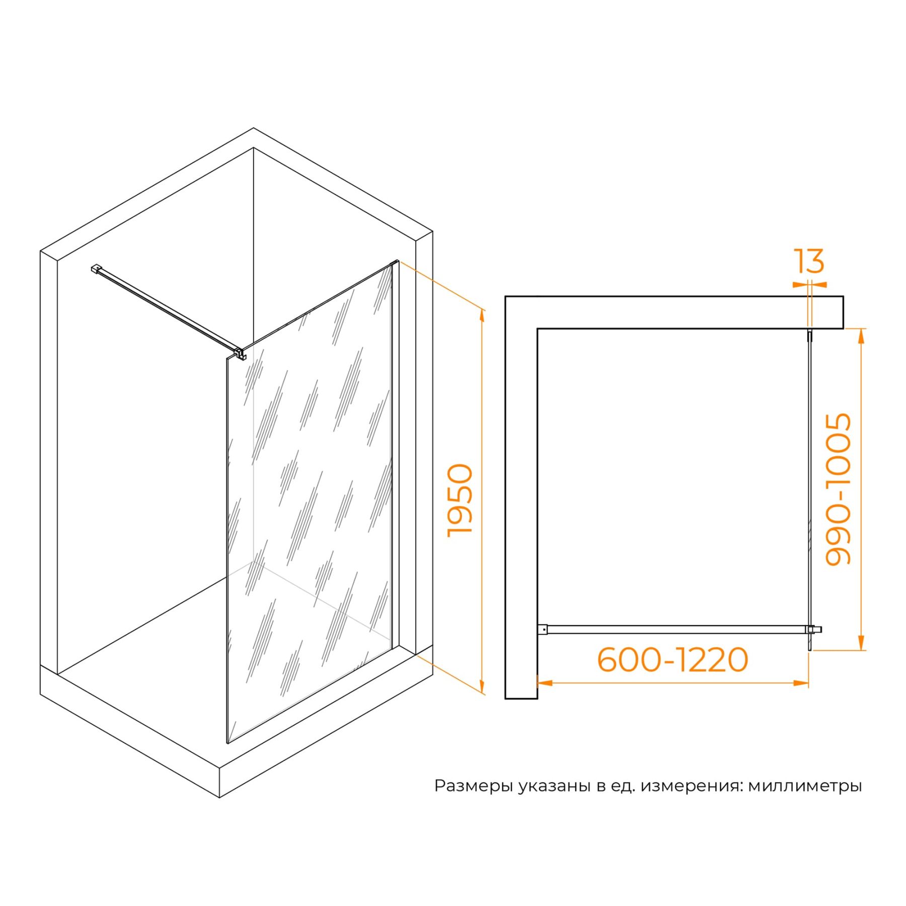 Стеклянная душевая перегородка с крючком высотой 1950 мм эффективна при установке на подиум для людей с высоким ростом, может также установиться на пол с плоским душевым поддоном или без дополнительной основы, на керамическую плитку с душевым трапом.