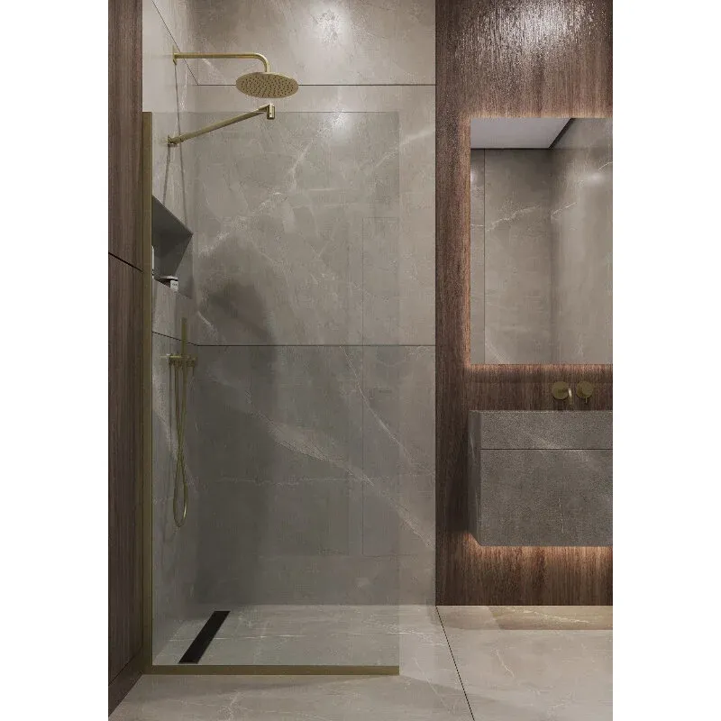 Душевая стенка Timo T13, 90 х 195 см, со свободным входом, стекло прозрачное, профиль золотоСтеклянная душевая перегородка Timo с профилем является элегантным и практичным решением для зонирования ванной комнаты. Изготовленная из закаленного стекла, она гарантирует безопасность и долговечность. Профиль из анодированного алюминия придаёт конструкции дополнительную прочность и устойчивость. Благодаря широкому выбору размеров и дизайнов, стеклянная душевая перегородка гармонично впишется в любое оформление интерьера.