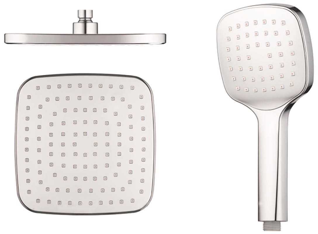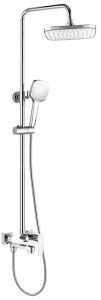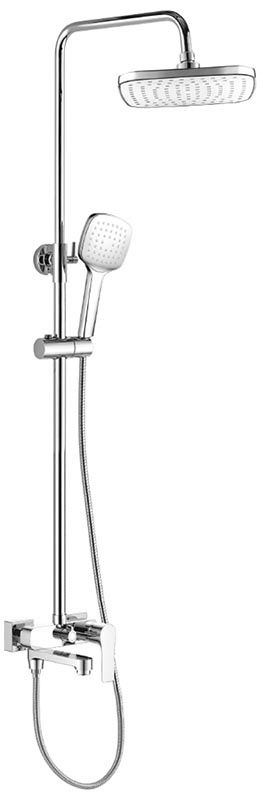 Душевая система в комплекте: однозахватный смеситель для ванны с керамическим картриджем и изливом (190 мм); верхний душ 200х200 мм (с силиконовыми наконечниками для просто удаления известкового налёта и регулировкой угла наклона), ручной душ 110х110 мм (1 режим), регулируемый по высоте и наклону держатель ручного душа, шланг 1,5 м (в металлической оплетке) с защитой от перекручивания, штанга телескопическая 880-1200 мм. Цвет глянцевый хром.