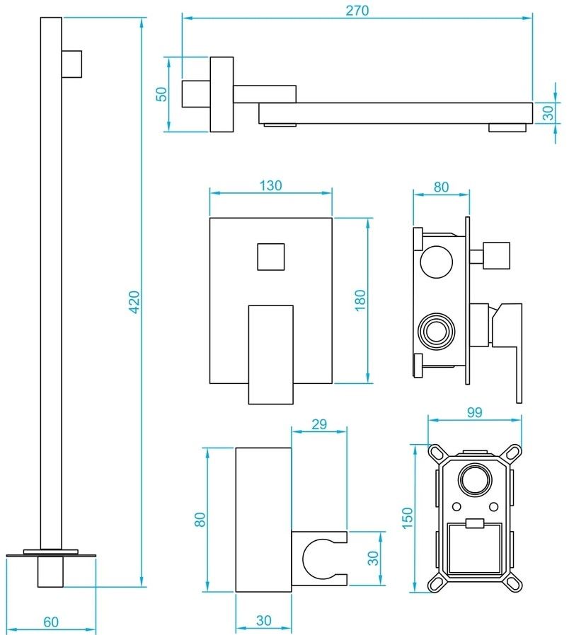 - Головной душ, горизонтальный держатель из нержавеющей стали. Головной душ оснащён шарнирным креплением, что позволяет выбрать необходимый угол направления воды