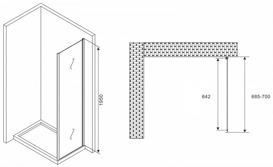 Размер (Ш*В): 700*1950 мм.Ориентация: универсальная.Толщина стекла: 6 мм.Профиль: хром.Стекло: прозрачное.