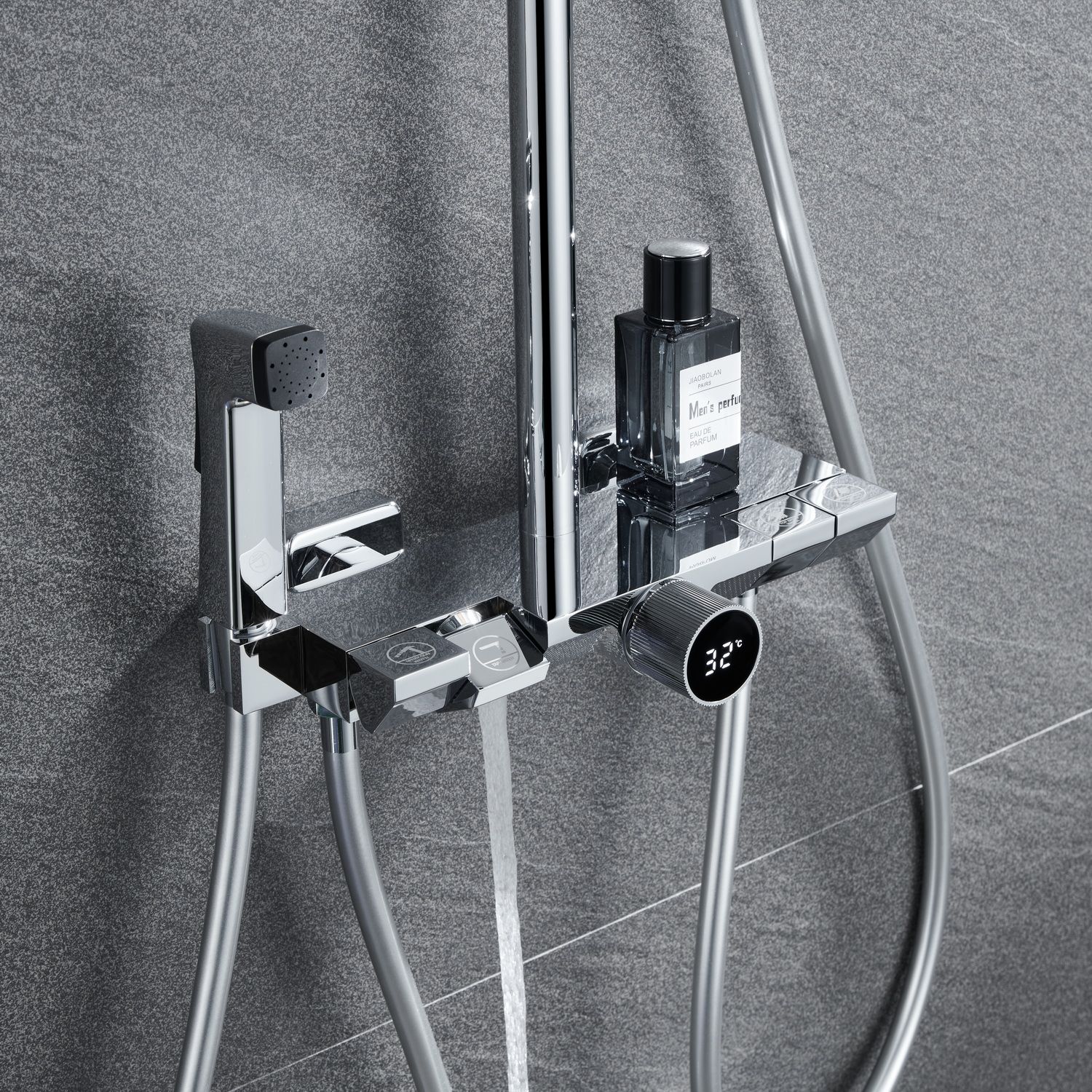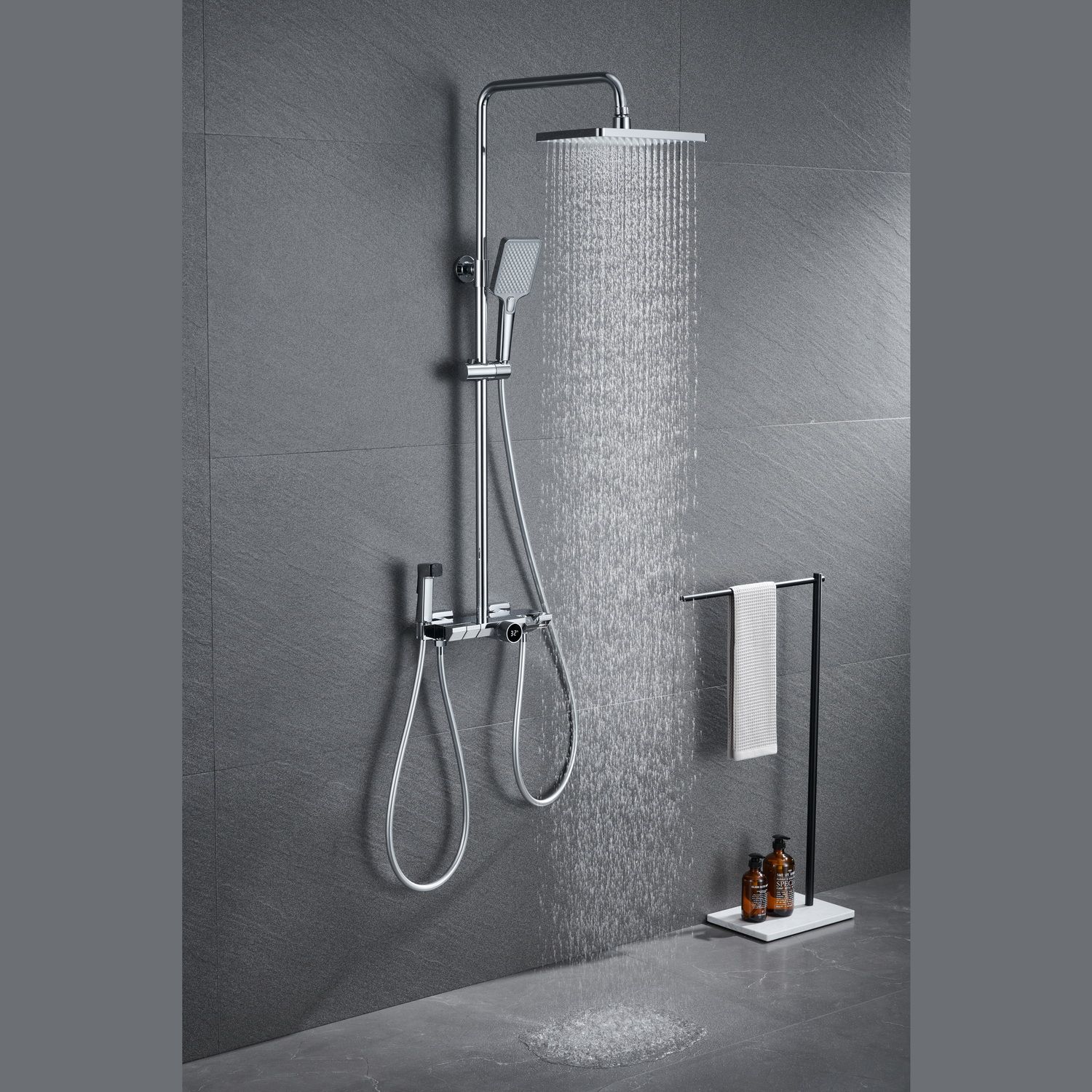 Душевая стойка датского производителя Black&White в цвете хром. Изделие изготовлено из сантехнической латуни, что говорит о высоком ресурсе и исключает возможность появления коррозии. На продукте установлен прогрессивный картридж с постоянным потоком воды и регулировкой температуры, показания которой выводится на табло, установленное в корпус ручки. Принцип работы – на изделие установлена машина постоянного тока, которая срабатывает от прохождения потоков воды.