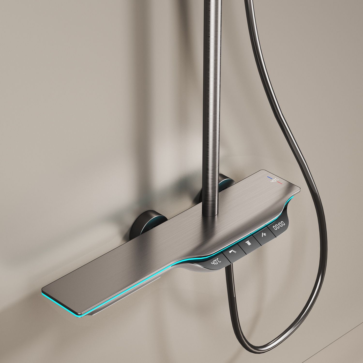 Из потребителей на системе установлен ручной режимный и верхний душ, а также излив скрытой установки и гигиенический душ. Выбор потока осуществляется через клавиши расположенные сверху корпуса смесителя.